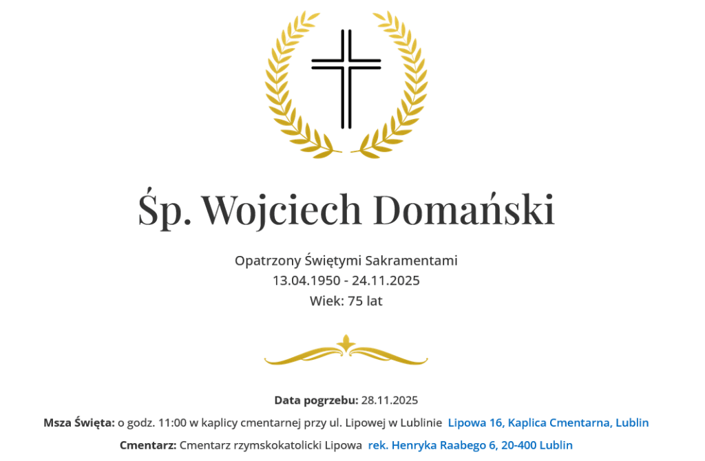 Nabożeństwo żałobne odbędzie się w piątek 28 listopada 2025r. o godz. 11.00 w kaplicy cmentarnej przy ul. Lipowej.