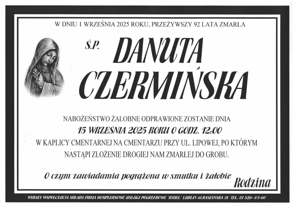 Nabożeństwo żałobne odbędzie się w poniedziałek 15 września 2025 roku o godzinie 12:00 w kaplicy cmentarnej przy ulicy Lipowej.